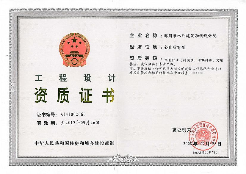 我院于2008年9月26日,圆满通过了中华人民共和国住房和城乡建设部水利行业(引调水、灌溉排涝、河道整治、城市防洪)专业甲级资质转正。