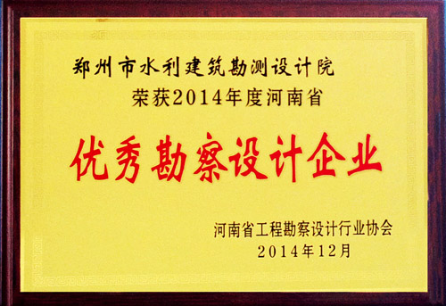 我院荣获2014年度河南省优秀勘察设计企业称号。