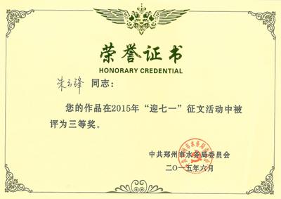 在郑州市水务局党委组织开展的“讴歌党的丰功伟绩,积极献身水务事业”主题征文活动中,我院选送的测量处副处长朱云峰结合测量外业岗位工作所撰写征文“践行‘三严三实’、助战水利测绘”,获得了征文评比三等奖。