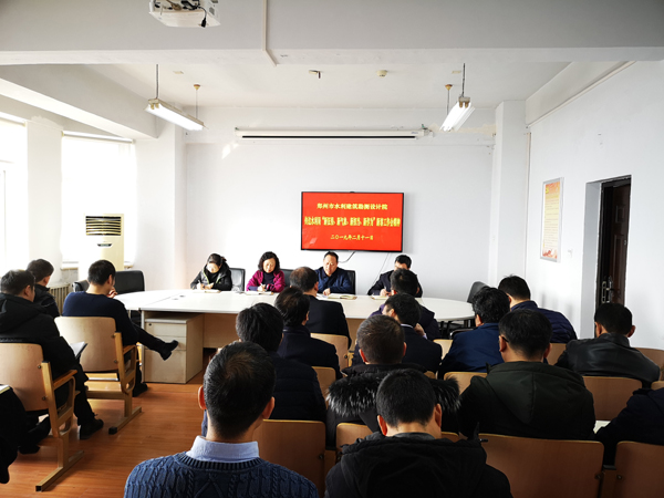 书记、院长耿传宇主持会议,首先传达了王新伟市长1月31日讲话精神,并带领大家重点学习了张胜利局长在新春工作启动会上的讲话。结合我院工作实际,他指出下步工作重点:一是在规范细致上下功夫。按照“质量、环境、职业健康”管理体系的要求,引入“6S”管理理念,使业务、管理工作更加细致规范。二是在科学创新上下功夫。各种软硬件满足工作需求的同时,在专业领域要有新突破。三是在用心服务上下功夫。抓住机遇,为郑州市水利事业、郑州建设国家中心城市提供更加优质的服务;四是在担当负责上下功夫。不断提升综合素养,在工作中积极主动,勇挑重担。