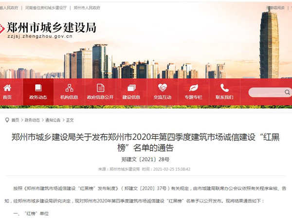 市水利建筑勘测设计院荣登郑州市2020年第四季度建筑市场诚信建设“红榜”