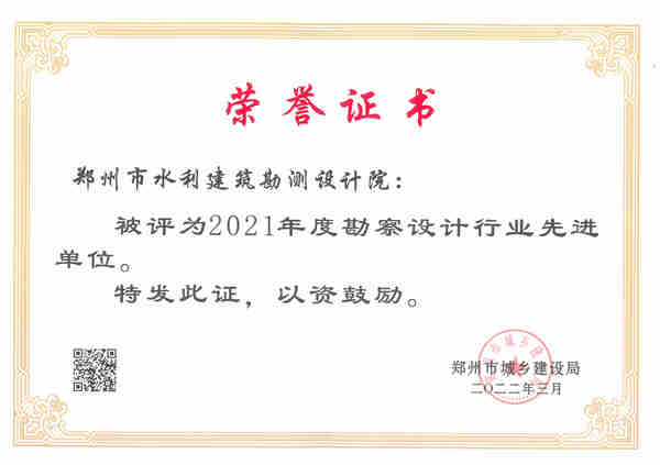 在郑州市城乡建设局《关于表彰2021年度建设系统先进单位先进企业和先进个人的通报》中,设计院被评为2021年度勘察设计行业先进单位,院长耿传宇被评为勘察设计管理先进个人,规划设计所所长、高级工程师张居平被评为2021年度优秀总工程师。