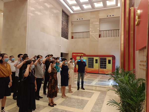 参观前,院党总支委员、工会主席王军红带领党员同志们举起右拳,面对党旗重温入党誓词。