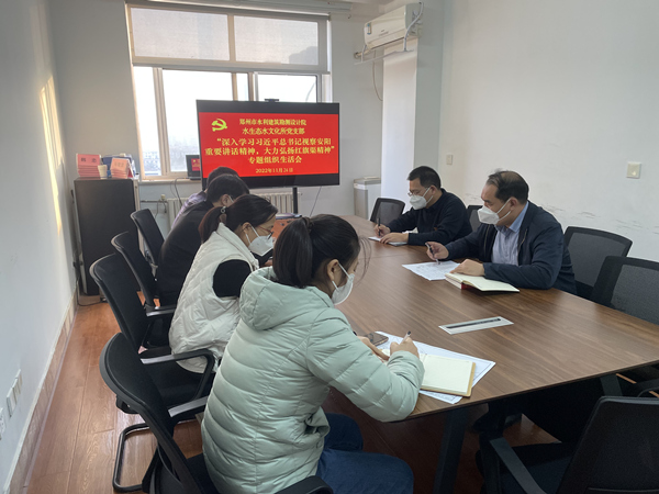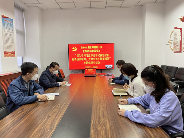 按照水利局直属机关党委通知要求,11月18日至28日,市水利建筑勘测设计院所属党支部纷纷以视频会议形式,召开了“深入学习习近平总书记视察安阳重要讲话精神,大力弘扬红旗渠精神”专题组织生活会。院党总支书记、总支委员以普通党员的身份参加所在党支部的专题组织生活会,并按照分工对分管党支部进行了指导。